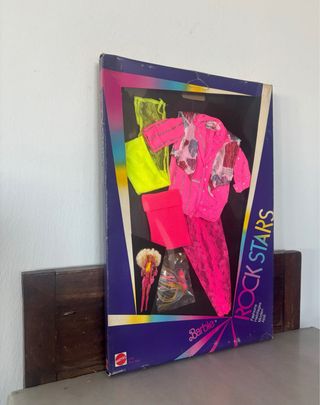Set di moda vintage Barbie Rock Star del 1985. Include vari capi di abbigliamento e accessori. Colori vivaci e design da rock star. Scatola leggermente danneggiata.