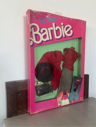 Set di abbigliamento e accessori per Barbie degli anni '80. Include giacca rossa, cappello nero, borsa e gonna. Disegnato da Mattel.