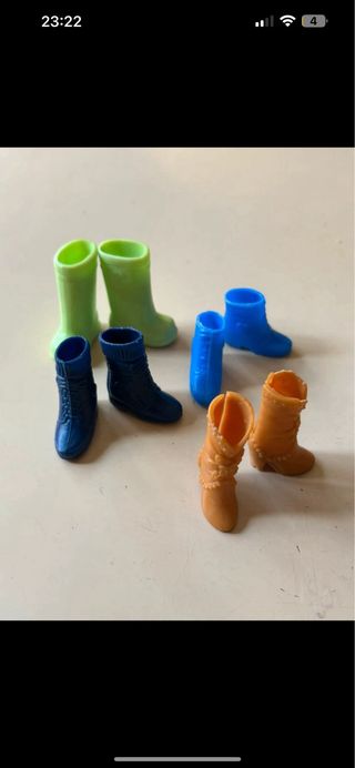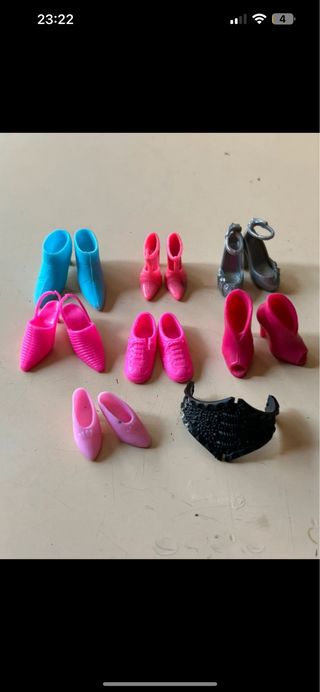 Set di vari paia di scarpe per bambola Barbie, stile vintage. Possono presentare difetti. - Scarpe col tacco rosa. - Stivali blu. - Scarpe basse rosa. - Scarpe sportive rosa. - Scarpe col tacco argentate. - Un accessorio nero. - Scarpe col tacco fucsia.