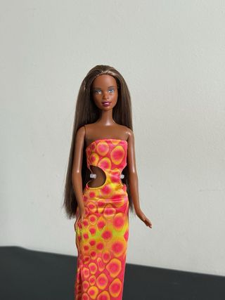 Barbie vintage con pelle scura. Un classico per collezionisti. Include occhiali da sole rosa, orecchini arancioni, collana dorata, giacca bianca con dettagli rossi e vestito rosa con stampa argentata.