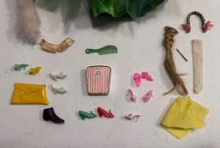 Set di accessori vintage per bambole Barbie. Include una varietà di pezzi per completare i look. - Vestito verde con velo blu. - Borsa gialla. - Scarpe di diversi colori e stili. - Spazzola. - Bilancia rosa. - Parrucca bionda. - Calzini bianchi. - Vestiti gialli piegati. - Stivali neri.