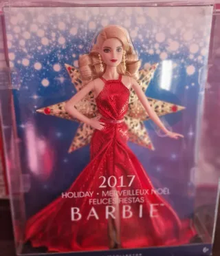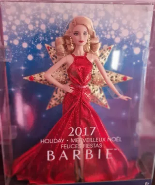 Barbie Holiday 2017, una muñeca da collezione per le feste. - Vestito rosso scintillante. - Orecchini dorati. - Sfondo a tema festivo con stelle.
