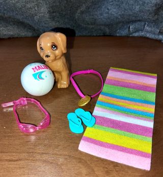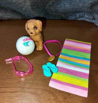 Set di accessori a tema spiaggia per bambole. - Cane marrone - Palla da spiaggia - Occhialini da nuoto rosa - Ciabattine blu - Asciugamano a righe - Collana con medaglione
