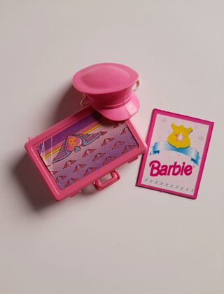In buonissimo stato (non posso dire eccellente per via dell'adesivo leggermente segnato nell'angolo come in foto🧐). Accessori Barbie Flight Time #9584 dell'anno 1989: valigetta, cappello e cartonato. Elastico del cappello in stato eccellente, angoli del cartonato pure 😍, conservati con amore per oltre trent'anni 🥰