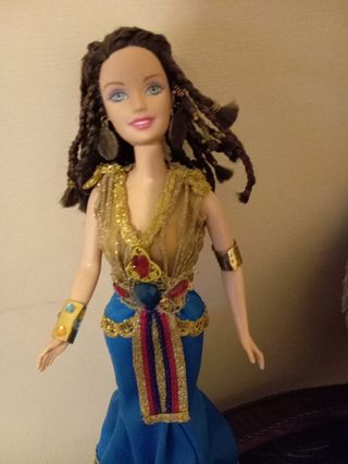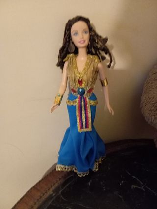 Barbie Mattel personalizzata con abito elegante e accessori. - Abito lungo color rame con dettagli dorati. - Sciarpa rossa con paillettes e ricami. - Copricapo dorato. - Bracciale decorato.