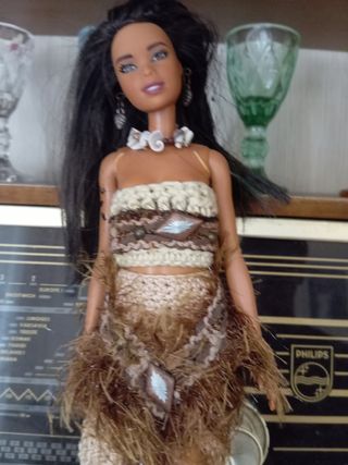 Bellissima Barbie personalizzata, ispirata a Pocahontas, con abito all'uncinetto. L'abito è composto da top e gonna, entrambi realizzati a mano con cura. I colori sono tenui e naturali. - Abito all'uncinetto fatto a mano - Ispirato al personaggio di Pocahontas - Perfetto per collezionisti di Barbie.