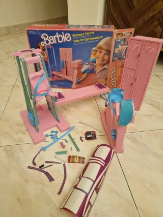 Centro fitness vintage Barbie anni '80, completo di accessori. Barbie fitness center Palestra vintage anni 80 Cyclette panca e armadietto sono integri e dai colori brillanti. Le staffe celesti presentano vari punti di rottura come evidenziato nelle foto. Sono presenti gli adesivi, i pesi e l'asciugamano. La scatola si presenta come da foto.