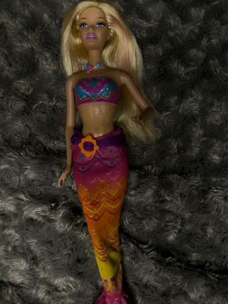 Bambola Barbie sirena con capelli colorati e coda arcobaleno. Usata ma buona - Capelli con sfumature arcobaleno. - Top a conchiglia. - Coda da sirena con decorazioni a stella. - Corona decorativa sui capelli.