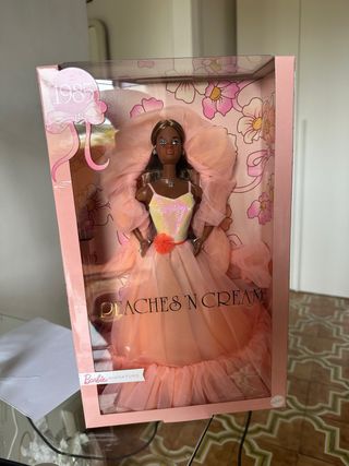 Riproduzione della iconica Barbie Peaches 'n Cream, edizione afroamericana. - Vestito scintillante e gonna ampia color pesca. - Completa e Nuova. - Dettagli floreali sulla confezione. Box leggermente ammaccata dal corriere