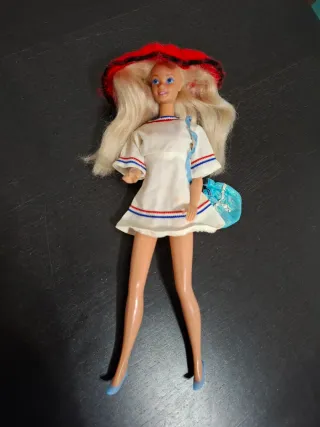 Bambola Barbie con un look vivace. (dipinto addosso) - Top rosso. - Shorts blu. - Capelli biondi raccolti con fiocco azzurro. - Scarpe nere.