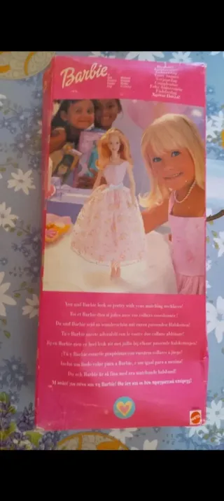 Bambola Barbie Buon Compleanno in confezione originale. La bambola indossa un abito rosa con decorazioni a tema.La scatola è un pochino rovinata sopra - Include collana di perle. - Accessori. - Scritta Buon Compleanno in diverse lingue sulla gonna.