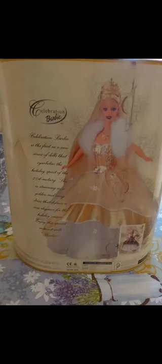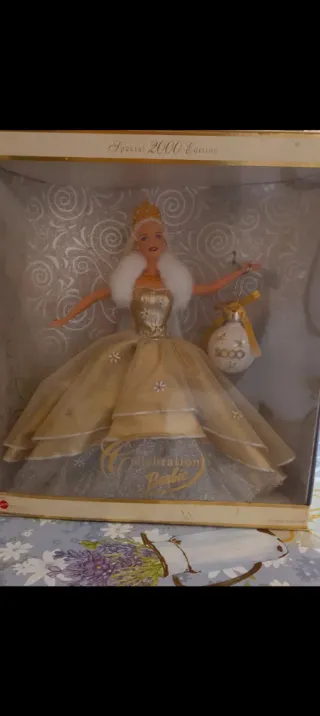 Barbie Magia Delle Feste, edizione speciale per l'anno 2000. - Vestito da sera dorato con dettagli scintillanti. - Accessorio a forma di palla di Natale con l'anno 2000. - Collo in pelliccia bianca.