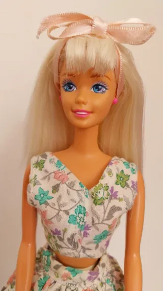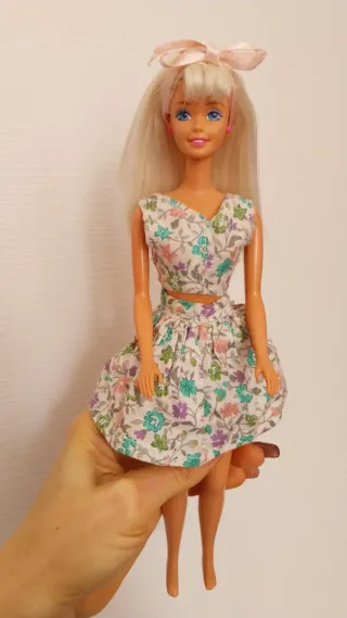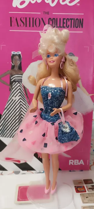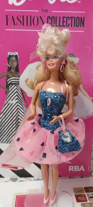 Bambola Barbie made in Malesia - Capelli biondi con fiocco con acconciatura anni 80 - Vestito blu denim con dettagli rosa. - Gonna rosa in tulle con pois neri e rosa. - Borsa abbinata. - Orecchini originali manca anello segnalo segnetto su mano sx
