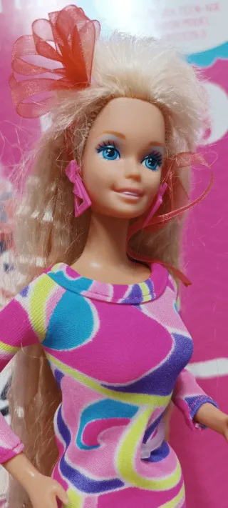 Bambola Barbie con capelli lunghi e folti, perfetta per collezionisti - Vestito colorato con fantasia astratta perfetto no smagliature Fiocco sui capelli non originale ma in allegato c'è un accessorio originale del set.. Scarpe non originali