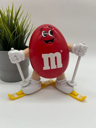 Dispenser per caramelle M&M's a tema sciatore, risalente al 1991. Un pezzo da collezione divertente. - Design rosso iconico M&M's. - Dettagli da sciatore con sci e bastoncini. - Anno di produzione 1991.