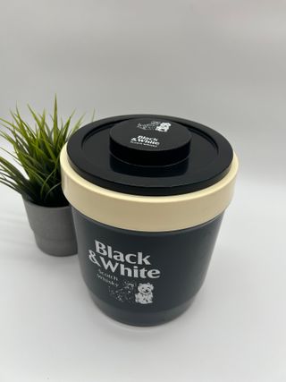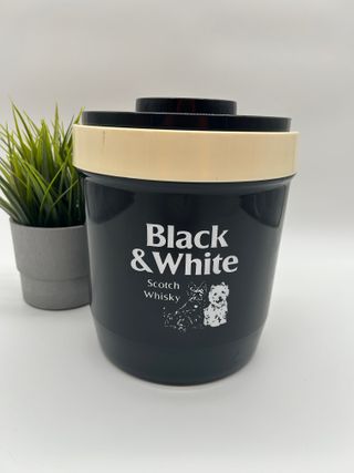 Ghiacciaia vintage Black & White Scotch Whisky. - Design iconico con logo e immagini dei cani. - Colore nero con finiture color crema. - Ideale per conservare il ghiaccio.