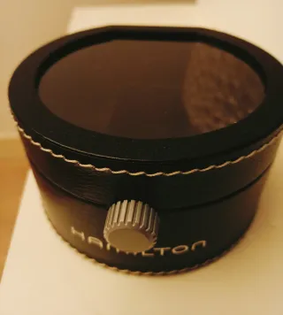 Scatola originale per orologi Hamilton risalente agli anni '90. Realizzata in similpelle nera con cuciture a vista. Di design ovale (diametro di 12 cm e alta 7 cm). Coperchio con inserto trasparente. Si apre girando la rotellina. Piccolo segno sul retro, come da foto. Non contiene il porta orologio