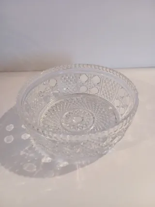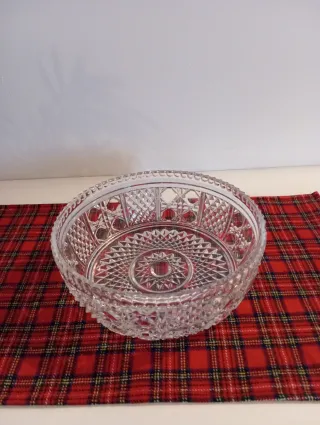 Elegante porta frutta in cristallo, perfetto per servire frutta o come centrotavola. - Realizzato in cristallo trasparente. - Design decorato con motivi geometrici. - Bordo rifinito con dettagli lavorati.