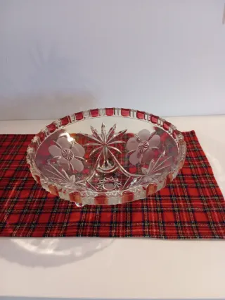 Elegante porta frutta in cristallo trasparente, perfetto per servire frutta o come centrotavola. - Realizzato in cristallo di alta qualità. - Design lavorato con motivi floreali e foglie. - Bordo sagomato e decorato.