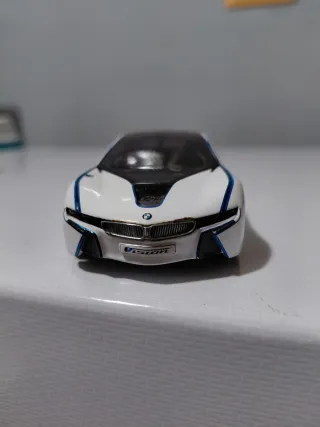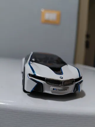 Modellino della BMW Vision in scala ridotta. Presenta un design sportivo e moderno. - Colore bianco con dettagli blu. - Logo BMW sul frontale. - Dicitura VISION sul paraurti anteriore.