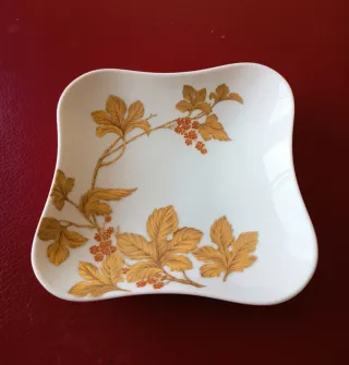Elegante piattino decorativo in porcellana vintage, AK Kaiser, serie Symphonie, design K. Nossek, con motivo a foglie e bacche in oro. - Forma irregolare e raffinata. Lunghezza cm 14,2