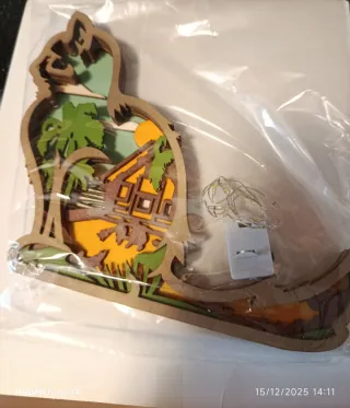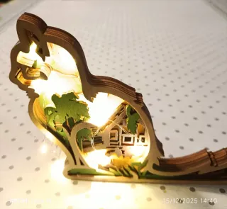 Delizioso gatto in legno intagliato con un paesaggio interno illuminato da lucine. - Realizzato in legno multistrato. - Design a strati che crea profondità. - Include lucine LED calde per un'atmosfera accogliente che si possono mettere a piacimento. Si può anche appendere perché c'è un foro dietro - Decorazione unica per la casa. L 18. H 14 profondità 1.5
