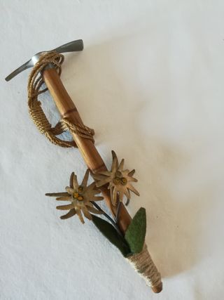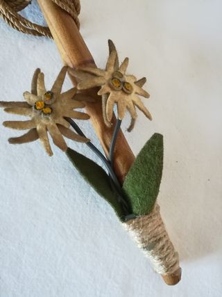 Un grazioso souvenir di montagna, dall'aspetto antico. - Manico in legno con corda intrecciata. - Decorazione con fiori di stella alpina e foglie. - Picco in metallo. - Lunghezza cm. 19 - Materiale: legno e fiori in feltro