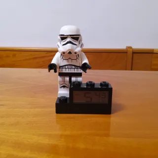 Divertente orologio sveglia a forma di personaggio LEGO di uno Stormtrooper di Star Wars. Perfetto per gli appassionati della saga.rarissimo per collezionisti pari al nuovo cm10x5x15h. - Design iconico LEGO. - Base nera con display digitale.