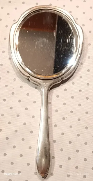 Elegante specchio da toeletta in Argento Sterling 925 fatto nella città di Sheffield nel 1935 dalla ditta Walker & Hall Lavorazione sul retro e manico guilloche' Peso Gr. 375 Altezza cm 28 Larghezza cm.12.5 Lo specchio presenta lievi segni del tempo - Materiale: Argento Sterling 925. - Design classico con manico.