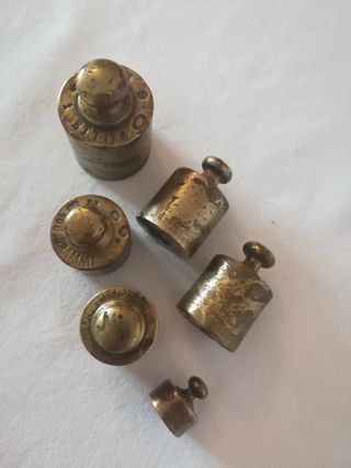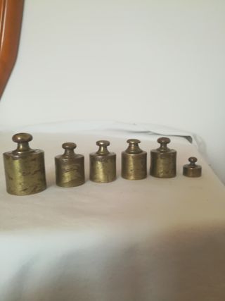 Set di vecchi pesi per bilancia in ottone. - Materiale: ottone - Set composto da 6 pezzi di diverse dimensioni - n. 1 200 grammi - n. 4 100 grammi - n. 1 20 grammi