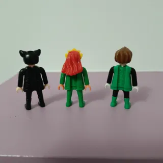 Set di 3 personaggi Playmobil, provenienti da sorprese Kinder. - Personaggio 1: Abito nero con maschera e orecchie da gatto. - Personaggio 2: Abito verde con dettagli dorati e capelli rossi. - Personaggio 3: Abito verde con simbolo Green Lantern sul petto e capelli castani.