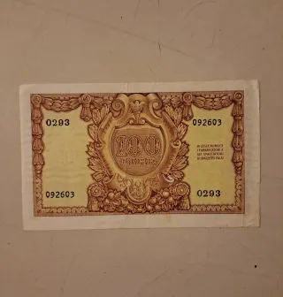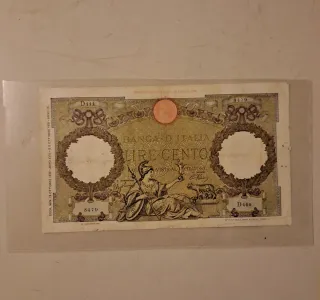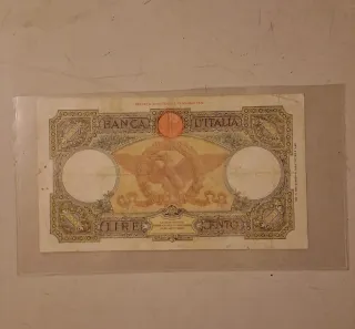 Banconota da 100 Lire emessa dalla Banca d'Italia. - Serie D444, numero 8479. - Data di emissione: Ottobre 1931 (Anno IX). - Diritto di stampa: Ottobre 1939 (Anno XVII). - Raffigura Vista al portatore.