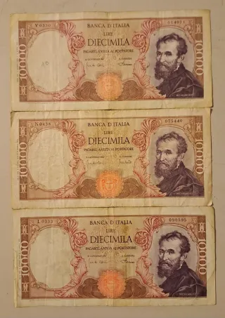 Lotto di 3 banconote da 10000 Lire della Banca d'Italia, raffiguranti il volto di Michelangelo. - Serie di 3 banconote. - Valore nominale: 10000 Lire ciascuna. - Soggetto: Michelangelo. - Emittente: Banca d'Italia.