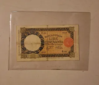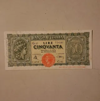 Banconota da 50 Lire emessa dalla Banca d'Italia nel 1944. - Valore: 50 Lire - Emittente: Banca d'Italia - Anno di emissione: 1944 - Serie: G 80 - Numero di serie: 034581