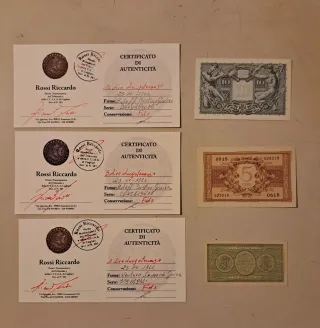 Lotto composto da banconote di Lire da 1, 5 e 10, accompagnate dai relativi certificati di autenticità. - Banconota da 1 Lira. - Banconota da 5 Lire. - Banconota da 10 Lire. - Certificati di autenticità firmati.