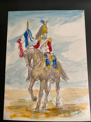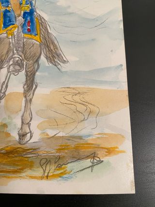 Tecnica: acquerello + matita su carta Acquerello su carta, soggetto cavaliere in uniforme di gusto napoleonico, firma monogrammata in basso a destra