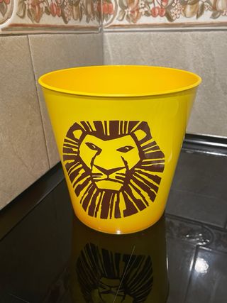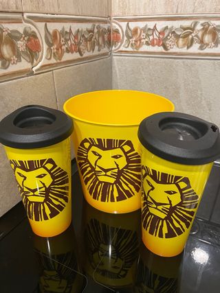 Set di due bicchieri con design de Il Re Leone. Perfetti per portare le tue bevande. - Colore giallo con stampa di leone. - Coperchio nero. - Include due bicchieri e un grande secchio.