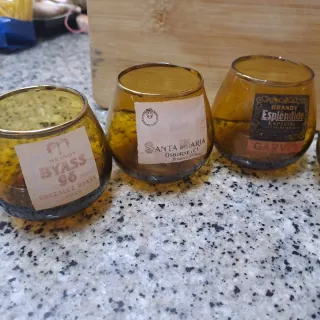 Set di sei bicchieri da brandy con un design unico e etichette vintage, anni '60. - Bicchieri in vetro ambra. - Ogni bicchiere ha un'etichetta diversa di marche di brandy. - Ideale per collezionisti o per un tocco di stile nel tuo bar.