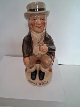 Set da collezione di Chivas Regal che include una figura decorativa e due bicchieri. - Figura in ceramica di un uomo seduto con cappello. - Due bicchieri da whisky con base intagliata e inclinati. - Iscrizione CHIVAS REGAL sulla base della figura.