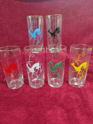Set di sei bicchieri vintage con un design decorativo di cervi. Ogni bicchiere ha un bordo dorato e una striscia dorata nella parte inferiore. Caratteristiche: Sei bicchieri. Design del cervo in diversi colori: blu, nero, rosso, bianco, verde e giallo. Bordo superiore dorato. Altezza: 13 cm.