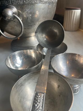 Ciotola da punch vintage in argento con bicchieri e cucchiaio