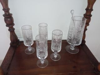 Set di quattro bicchieri vintage in cristallo, perfetti per ogni occasione. Include un miscelatore. Primi anni '50 - Design elegante e raffinato. - Cristallo trasparente con decorazioni intagliate. - Base stabile per una maggiore sicurezza.