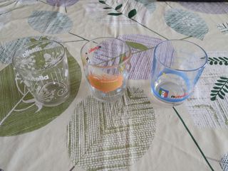 Set di due bicchieri della marca Sandaru. Presentano un design con il logo del marchio e la frase Un naranja, un limón. Possono avere più di 70 anni. Perfetto stato. Nessuna scheggiatura o usura. Misure: 11 x 7 cm. Design con logo Sandaru. Frase Un naranja, un limón.
