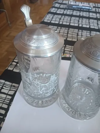 Set di due bicchieri da birra in stile tedesco. Perfetto per collezionisti o per gustare una bevanda. - Materiale: Vetro e metallo. - Design classico con coperchio. - Ogni bicchiere ha un'impugnatura.