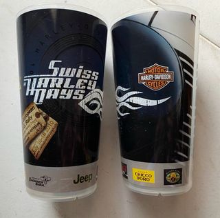 Set di 2 bicchieri in plastica per birra, a tema Swiss Harley Days 2010. - Design con logo Harley-Davidson e Swiss Harley Days. - Grafica ispirata ai biglietti dell'evento 9th European H.O.G. Rally tenutosi a Lugano nel luglio 2010. - Marchi Jeep e Tuchinen Bräu visibili alla base.