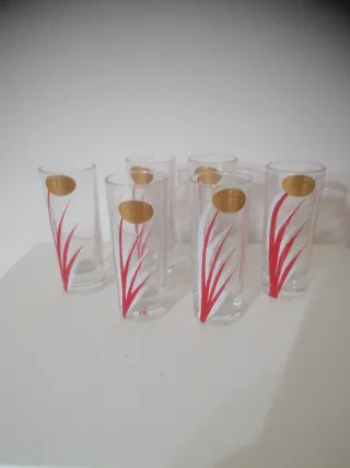 Set di sei bicchieri vintage risalenti agli anni '60 o '70. Presentano un design con decorazioni rosse e bianche e un dettaglio dorato. - Set da 6 bicchieri.Da whisky - Decorazione floreale stilizzata. - Dettaglio ovale dorato.
