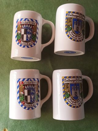 Set di quattro bicchieri da birra in ceramica con design tradizionali tedeschi. - Due bicchieri con lo stemma di Reichelbräu Kulmbach. - Due bicchieri con lo stemma di Weilburger Pilsener. - Design dettagliati e colorati.