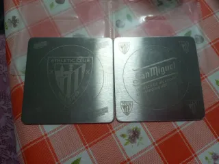 Due sottobicchieri metallici con lo stemma dell'Athletic Club di Bilbao e il logo di San Miguel. - Nella loro confezione originale - Design inciso. - Stemma dell'Athletic Club. - Logo di San Miguel con motto Birra da un posto chiamato mondo.