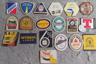 Set di 12 posa bicchieri di marche e design diversi. Ideali per birra e bevande. Design assortiti. Realizzati in cartone.
