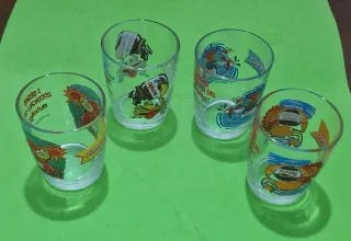 Set di 5 bicchieri vintage: 4 con personaggi dei cartoni animati (Nutella, Puffi, Popeye, Sport, Oroscopo, Nomi) e 1 con i Looney Tunes. Sono in perfette condizioni, mai usati. (il nome Antonella è stato venduto) - 4 bicchieri con immagini diverse di cartoni animati. - 1 bicchiere con i Looney Tunes. - Design vintage.